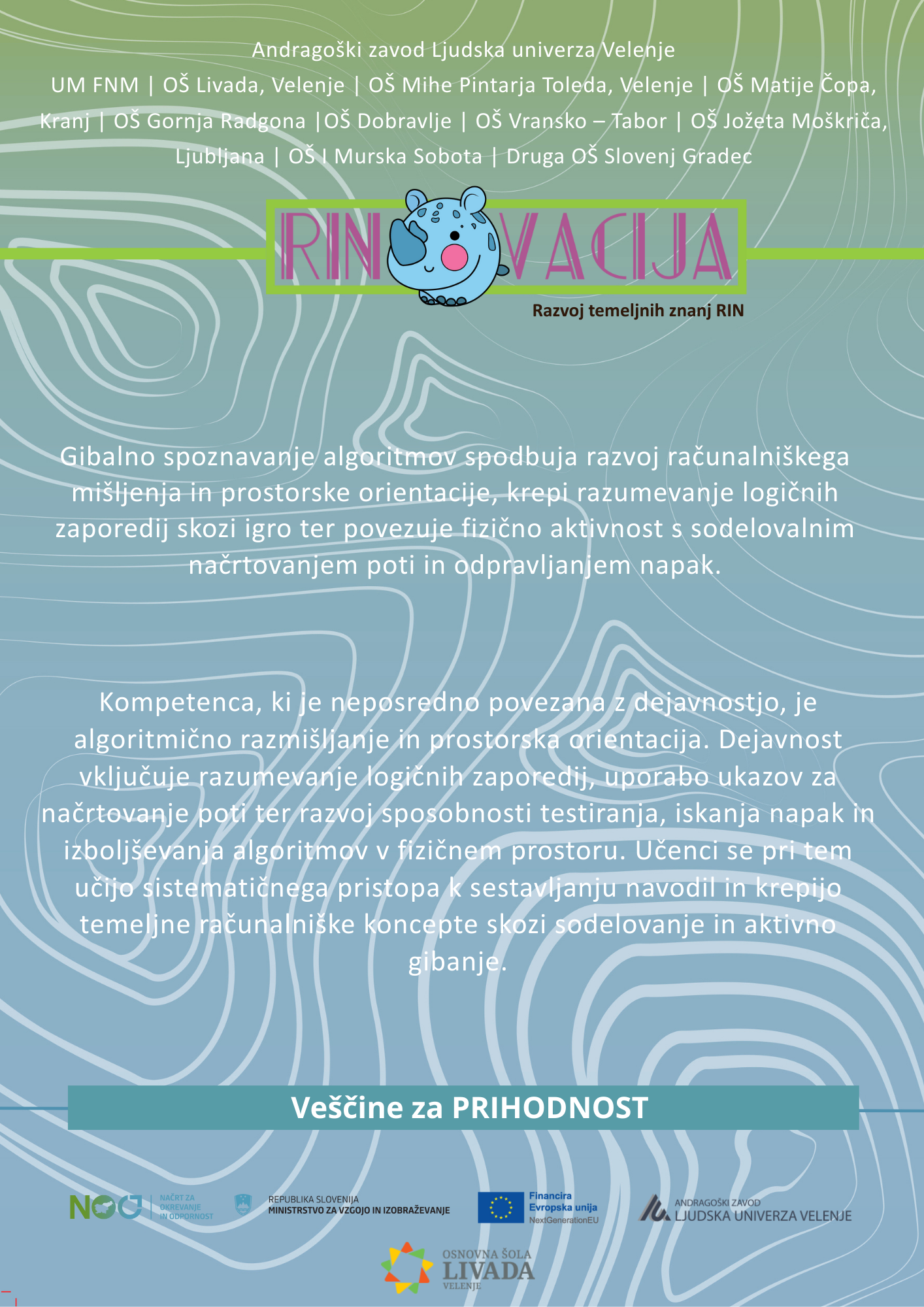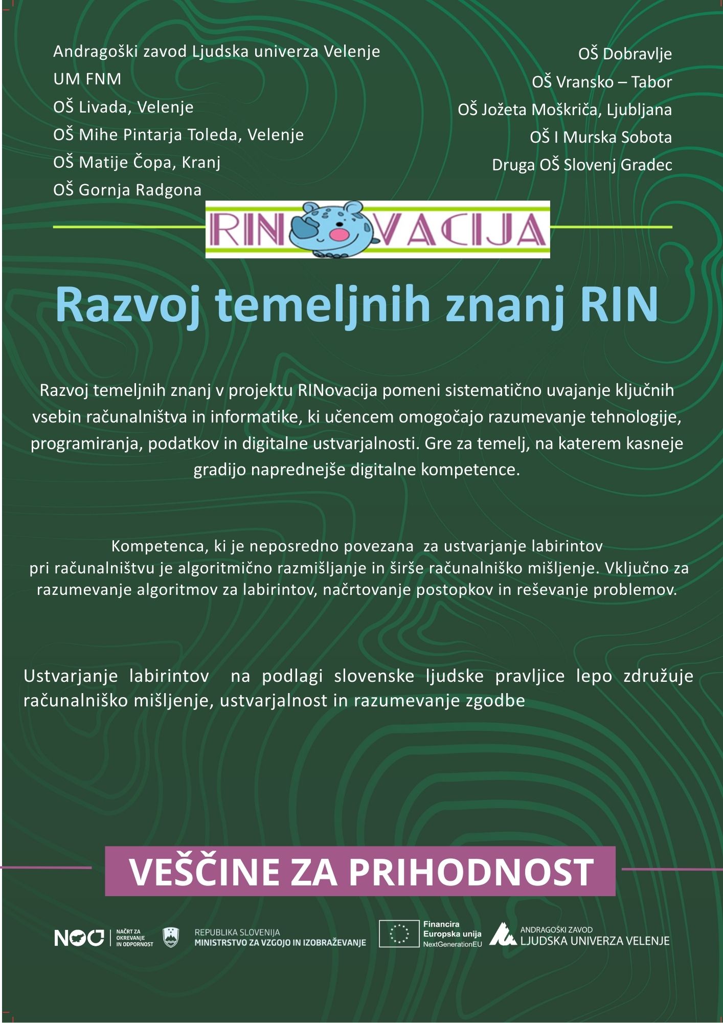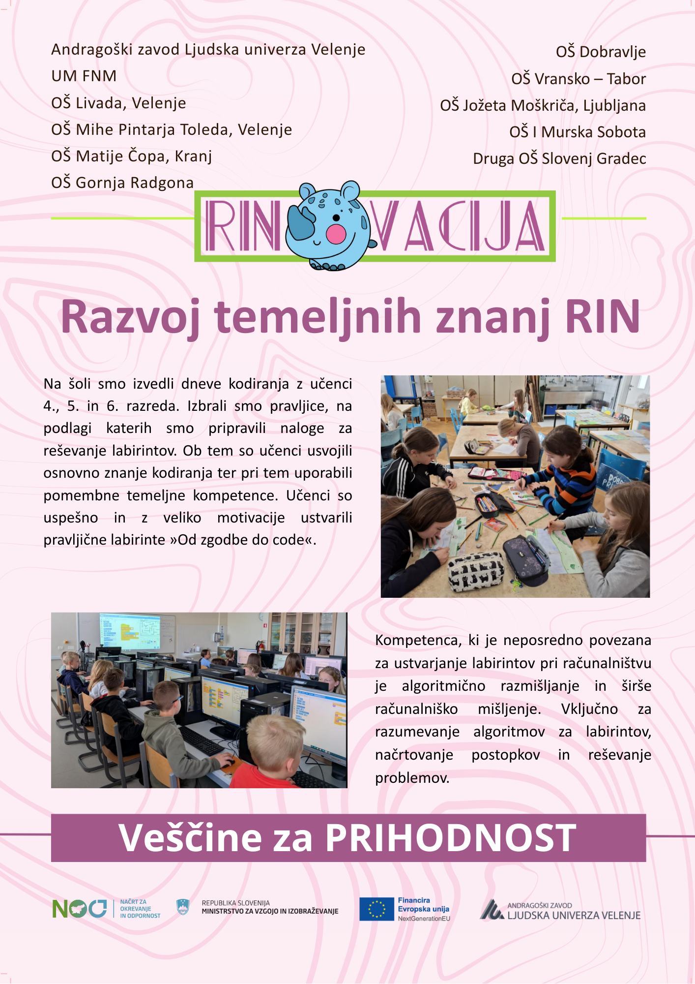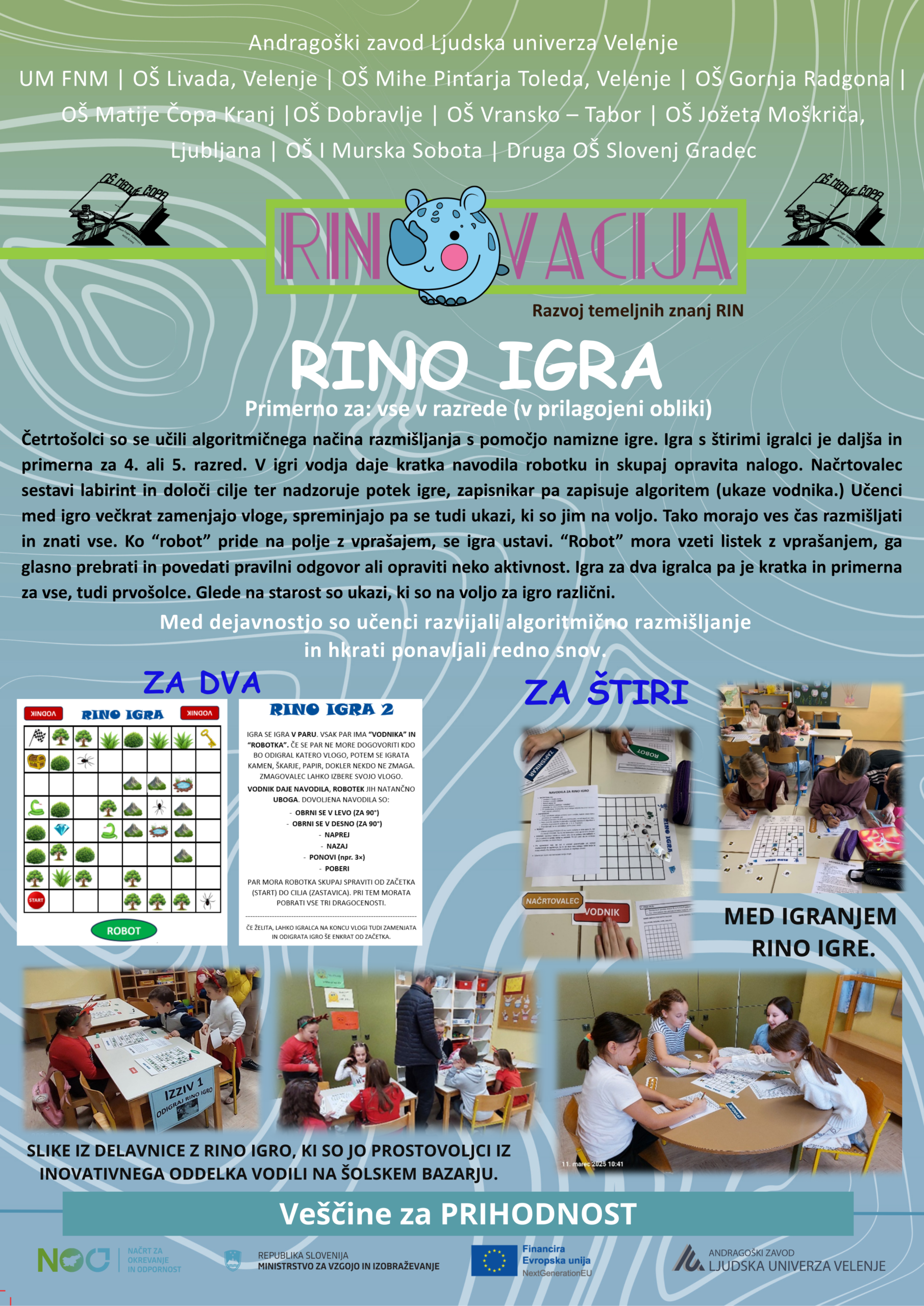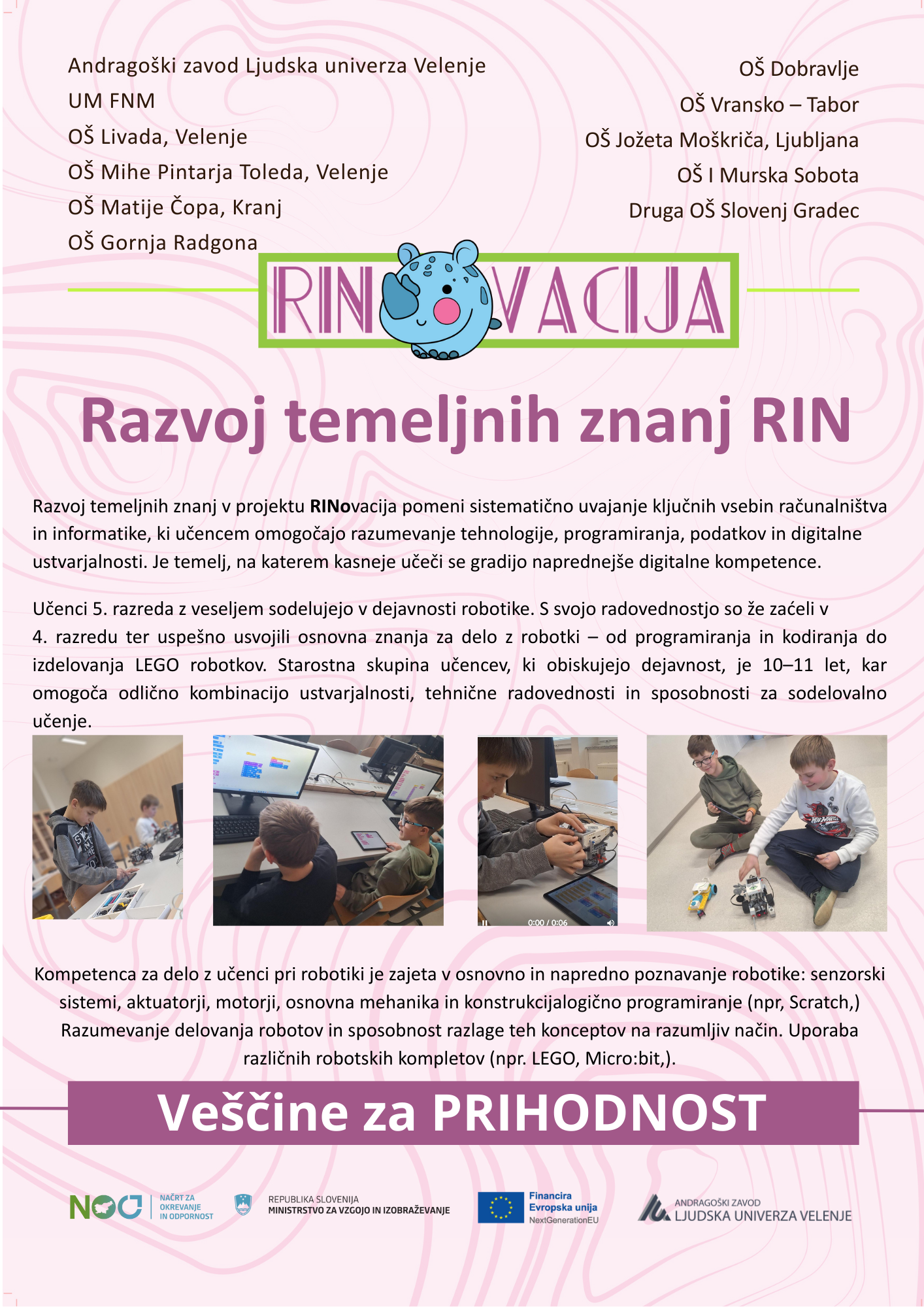Projekt RINOvacija naslavlja enega ključnih izzivov sodobnega izobraževalnega sistema – razvoj digitalnih kompetenc in temeljnih znanj računalništva in informatike (RIN) pri učencih osnovnih šol. Temelji na prepoznani potrebi po usklajevanju pedagoških pristopov z realnostjo digitalne dobe ter na integraciji inovativnih učnih metod, ki spodbujajo razvoj tehničnih in mehkih veščin hkrati. Glavni cilj projekta je vzpostavitev inovativnih učnih okolij, kjer bodo učenci prek praktičnega dela, projektnega učenja in sodelovanja pridobivali temeljna znanja računalništva, programiranja, robotike ter razvijali kritično mišljenje, ustvarjalnost, timsko delo in digitalno pismenost. Pedagoški okvir RINOvacije je usklajen z evropskimi strategijami (npr. Priporočilo Sveta EU o ključnih kompetencah za vseživljenjsko učenje), smernicami Education 4.0 ter temelji na sodobnih raziskovalnih ugotovitvah in izkušnjah preteklih projektov (npr. RINOS, DigiSi mladi, AI4T ipd.). Uresničevanje ciljev bo potekalo znotraj konsorcija desetih osnovnih šol, Andragoškega zavoda Ljudska univerza Velenje kot prijavitelja, Univerze v Mariboru (FNM) kot evalvatorja in dveh zunanjih izvajalcev – podjetij CodeBrainer in Brihtna Buča. Projekt traja od septembra 2024 do junija 2026 in zajema dve šolski leti. Vključuje oblikovanje in implementacijo inovativnih oddelkov, razvoj učnih scenarijev in vsebin, izobraževanje učiteljev, dnevov dejavnosti z vsebinami RIN ter evalvacijo učinkov na ravni učencev in učiteljev. Vzpostavljena bodo tudi sodelovanja z lokalnim okoljem ter priložnosti za učence za sodelovanje na tekmovanjih in dogodkih s področja računalništva in informatike. RINOvacija je celovit odgovor na potrebe slovenskega šolskega prostora – ni le projekt, ampak vizija prihodnosti izobraževanja, kjer tehnologija ni sama sebi namen, temveč orodje za ustvarjanje, raziskovanje in izboljševanje sveta, v katerem živimo.