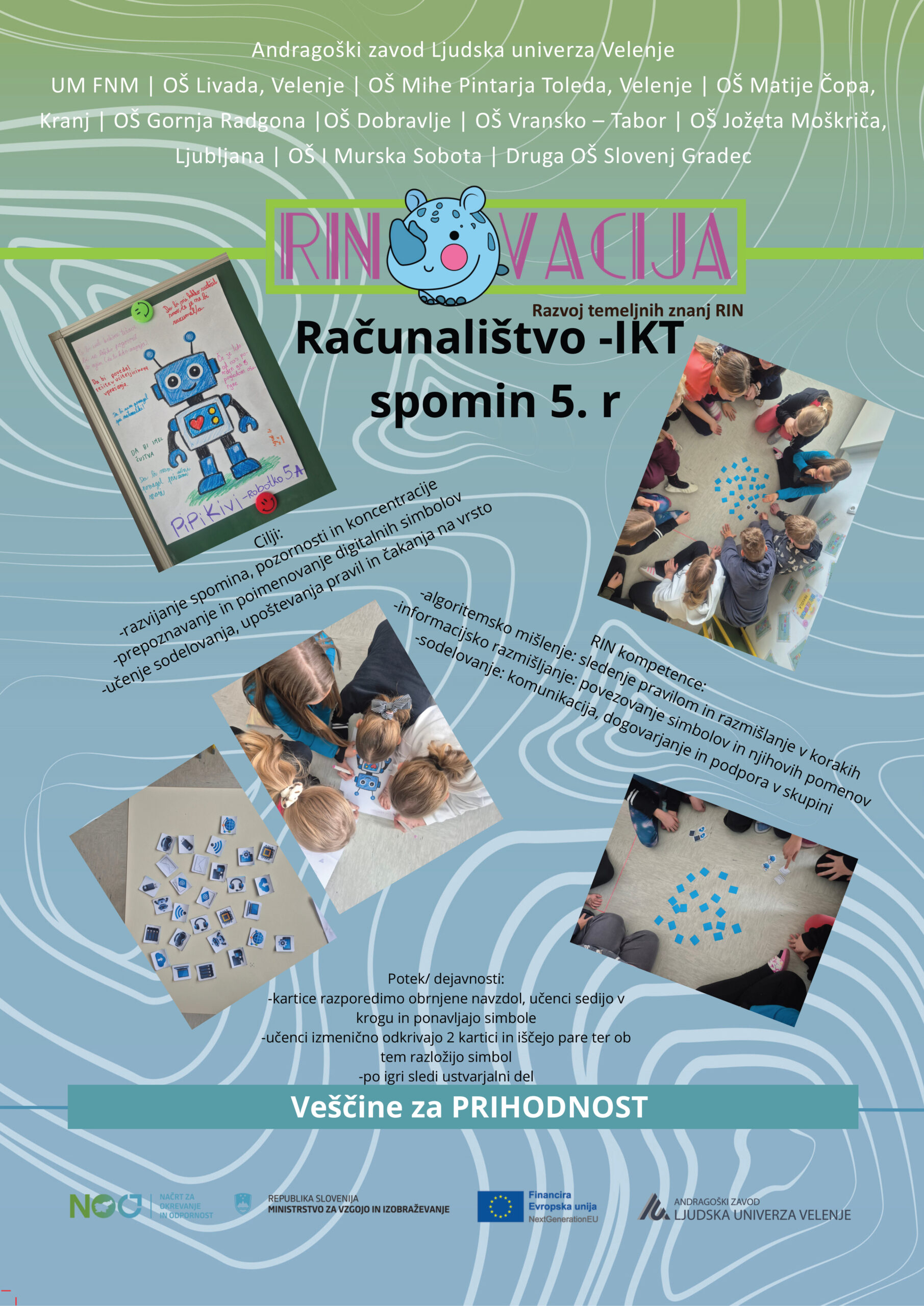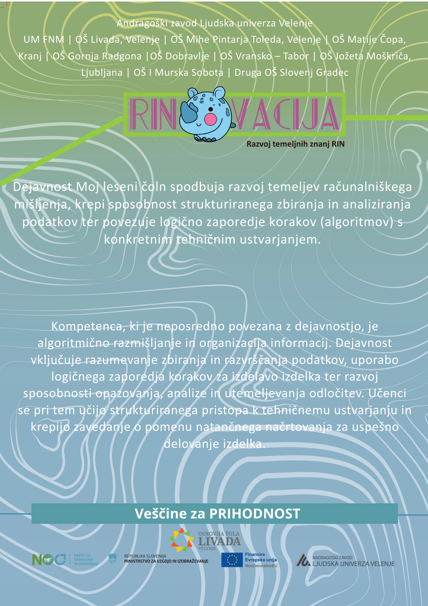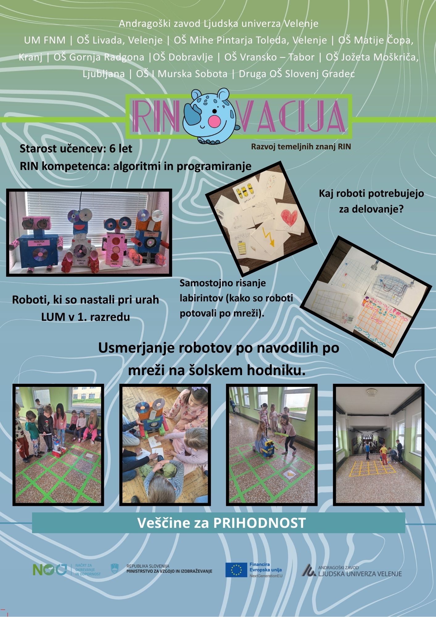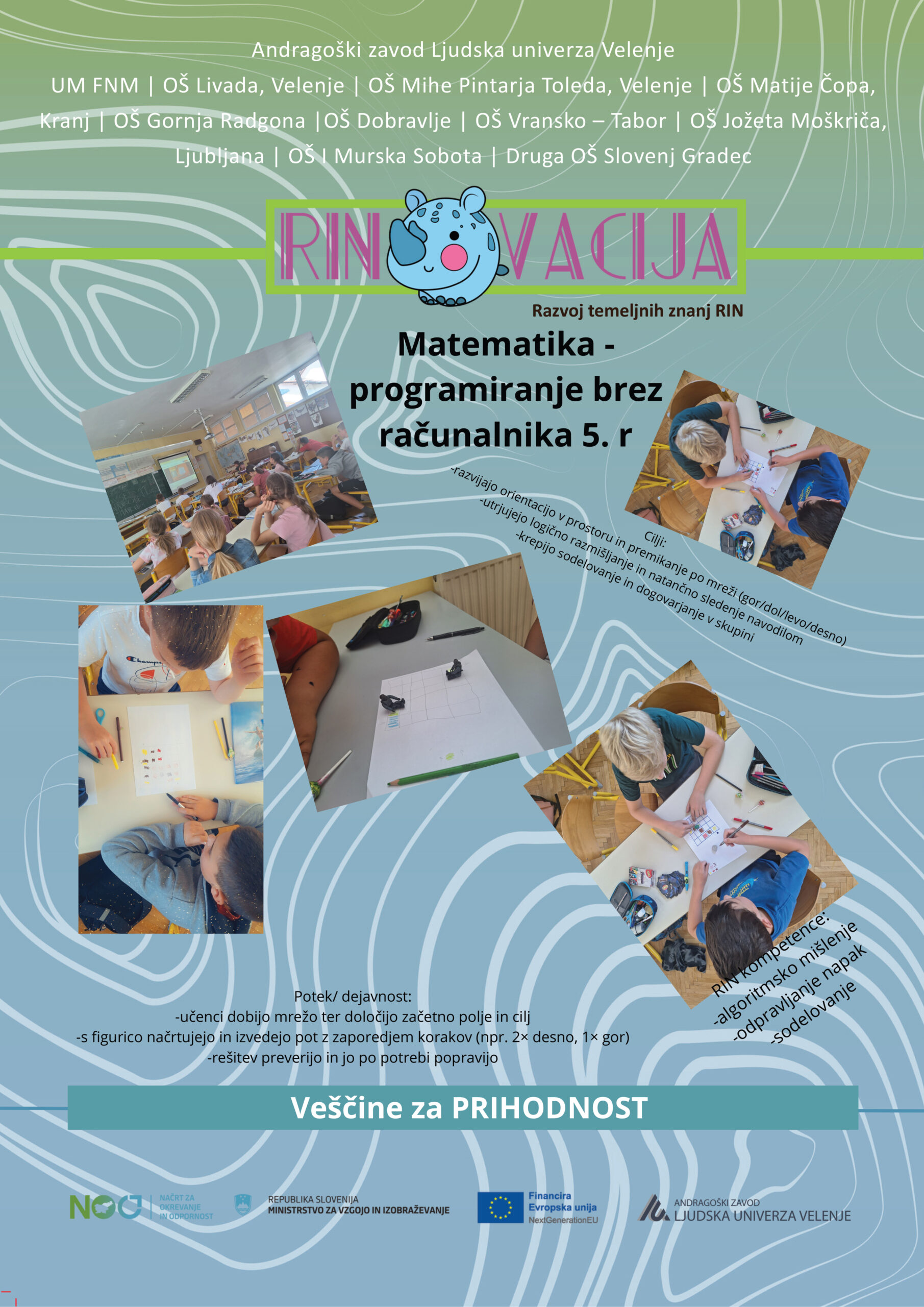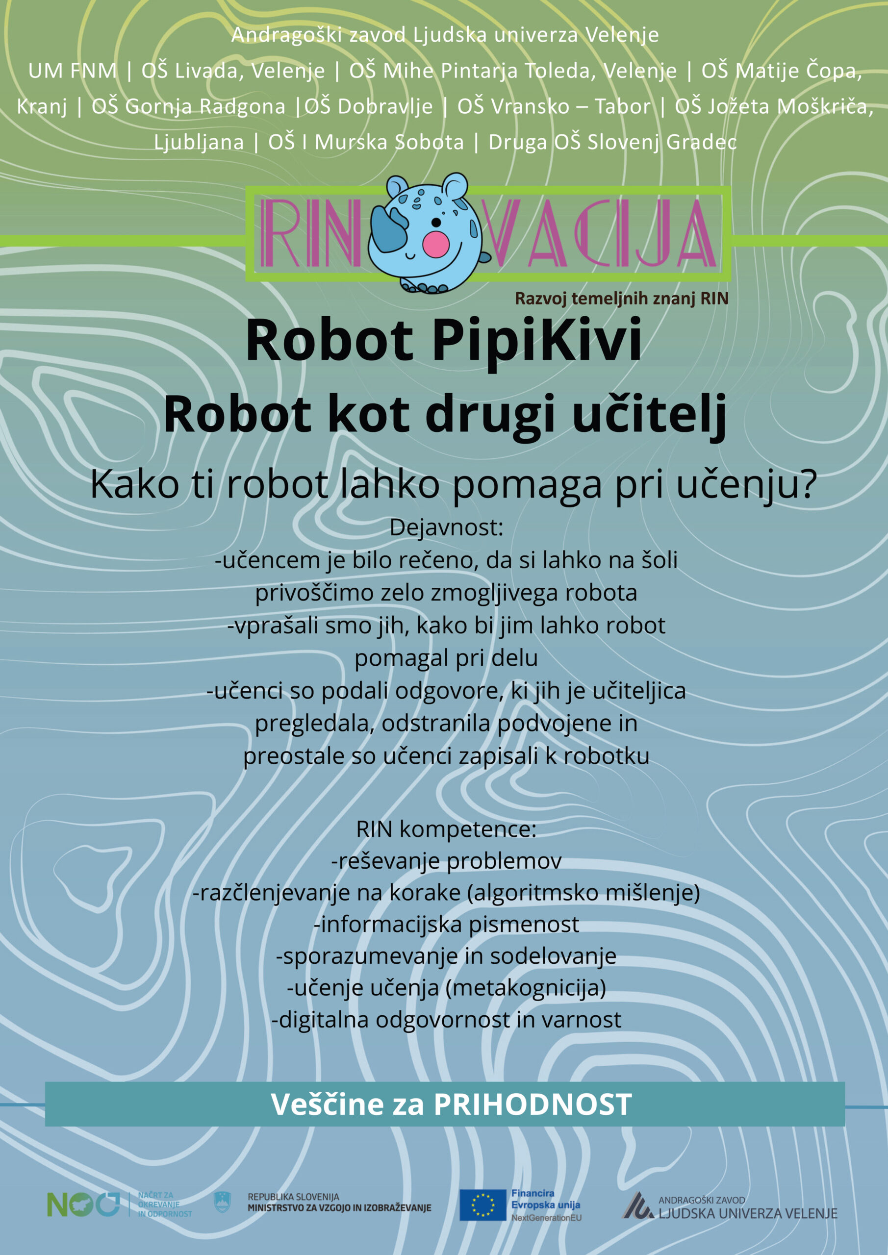 Projekt RINOvacija naslavlja enega ključnih izzivov sodobnega izobraževalnega sistema – razvoj digitalnih kompetenc in temeljnih znanj računalništva in informatike (RIN) pri učencih osnovnih šol. Temelji na prepoznani potrebi po usklajevanju pedagoških pristopov z realnostjo digitalne dobe ter na integraciji inovativnih učnih metod, ki spodbujajo razvoj tehničnih in mehkih veščin hkrati. Glavni cilj projekta je vzpostavitev inovativnih učnih okolij, kjer bodo učenci prek praktičnega dela, projektnega učenja in sodelovanja pridobivali temeljna znanja računalništva, programiranja, robotike ter razvijali kritično mišljenje, ustvarjalnost, timsko delo in digitalno pismenost. Pedagoški okvir RINOvacije je usklajen z evropskimi strategijami (npr. Priporočilo Sveta EU o ključnih kompetencah za vseživljenjsko učenje), smernicami Education 4.0 ter temelji na sodobnih raziskovalnih ugotovitvah in izkušnjah preteklih projektov (npr. RINOS, DigiSi mladi, AI4T ipd.). Uresničevanje ciljev bo potekalo znotraj konsorcija desetih osnovnih šol, Andragoškega zavoda Ljudska univerza Velenje kot prijavitelja, Univerze v Mariboru (FNM) kot evalvatorja in dveh zunanjih izvajalcev – podjetij CodeBrainer in Brihtna Buča. Projekt traja od septembra 2024 do junija 2026 in zajema dve šolski leti. Vključuje oblikovanje in implementacijo inovativnih oddelkov, razvoj učnih scenarijev in vsebin, izobraževanje učiteljev, dnevov dejavnosti z vsebinami RIN ter evalvacijo učinkov na ravni učencev in učiteljev. Vzpostavljena bodo tudi sodelovanja z lokalnim okoljem ter priložnosti za učence za sodelovanje na tekmovanjih in dogodkih s področja računalništva in informatike. RINOvacija je celovit odgovor na potrebe slovenskega šolskega prostora – ni le projekt, ampak vizija prihodnosti izobraževanja, kjer tehnologija ni sama sebi namen, temveč orodje za ustvarjanje, raziskovanje in izboljševanje sveta, v katerem živimo.