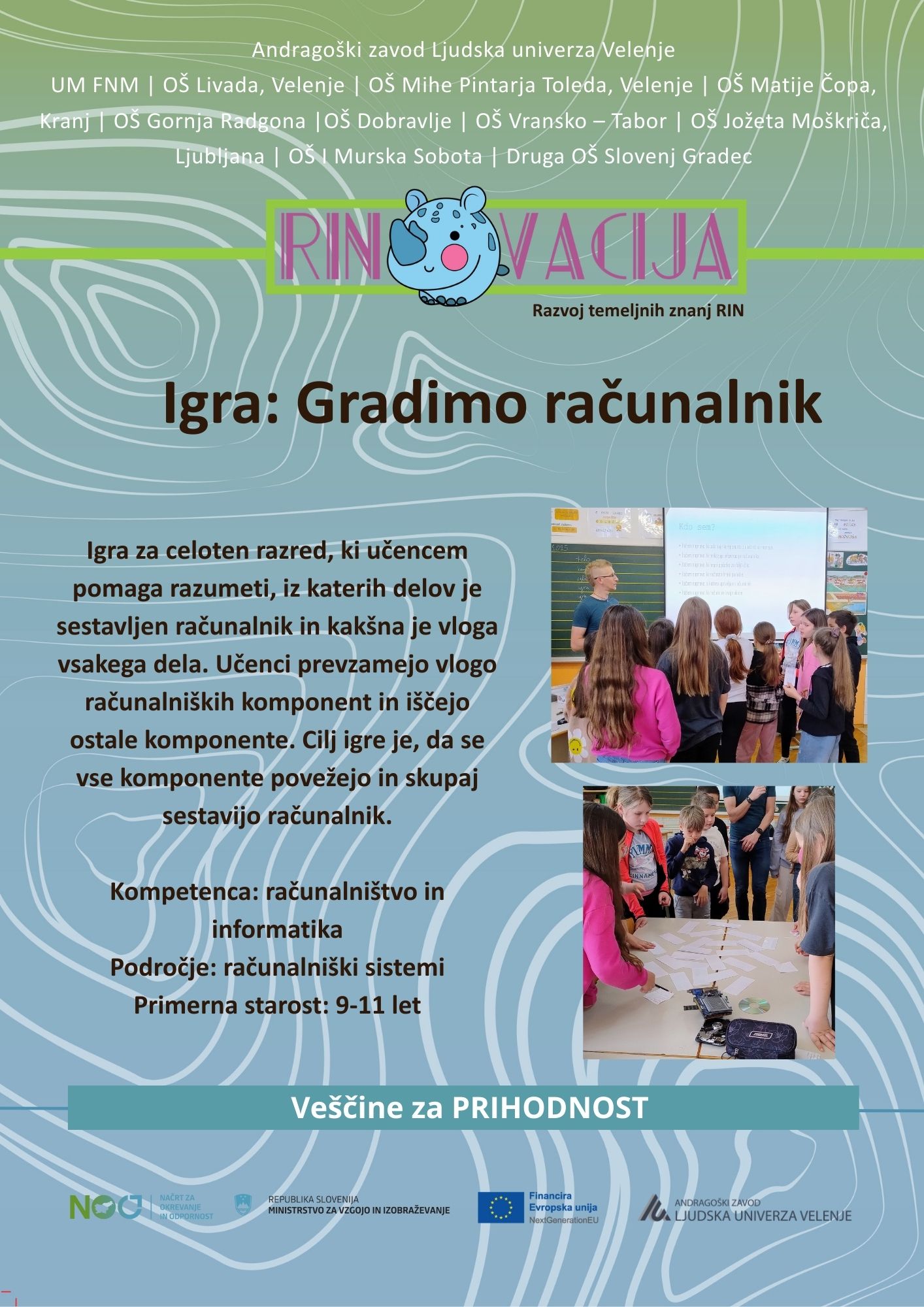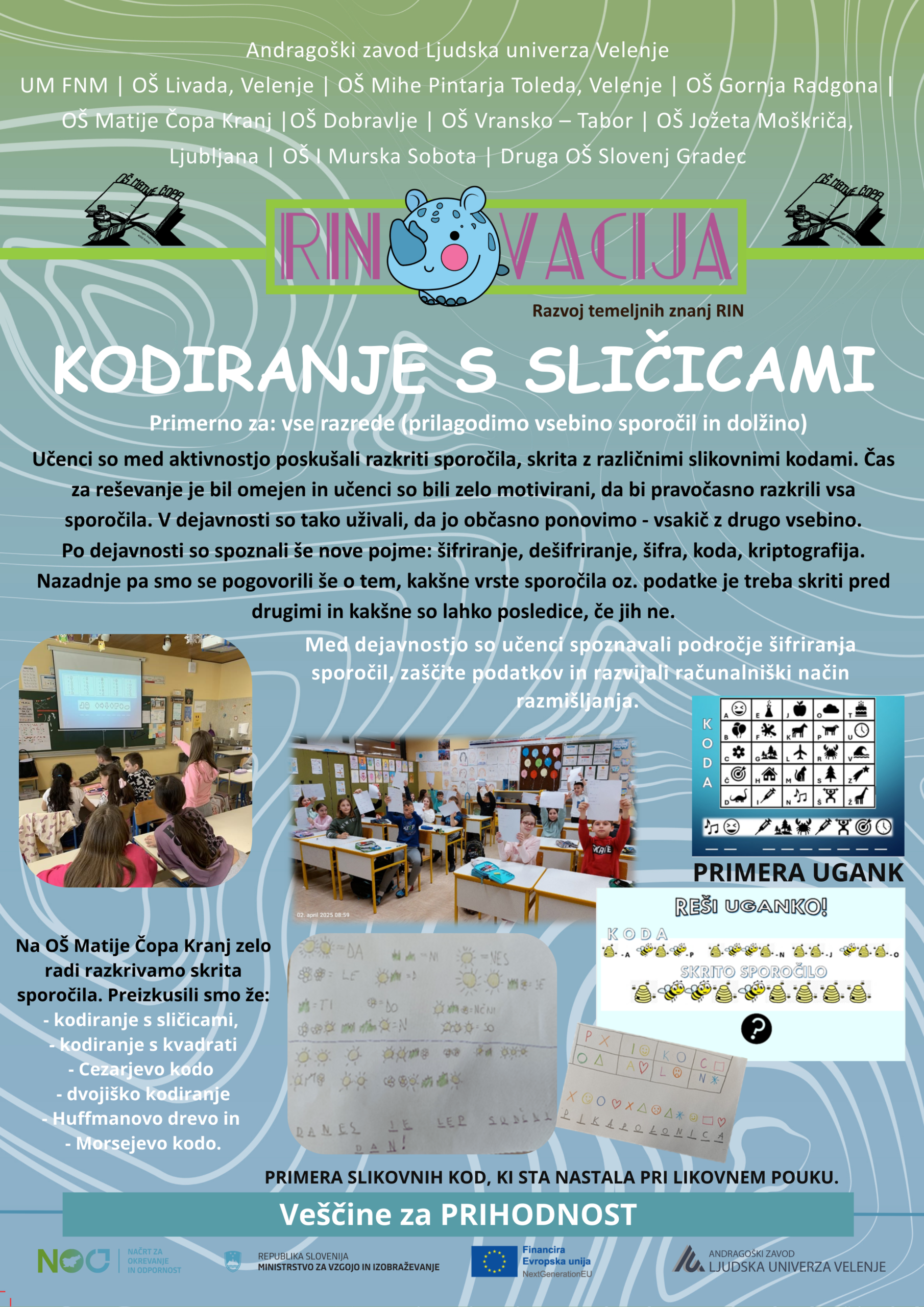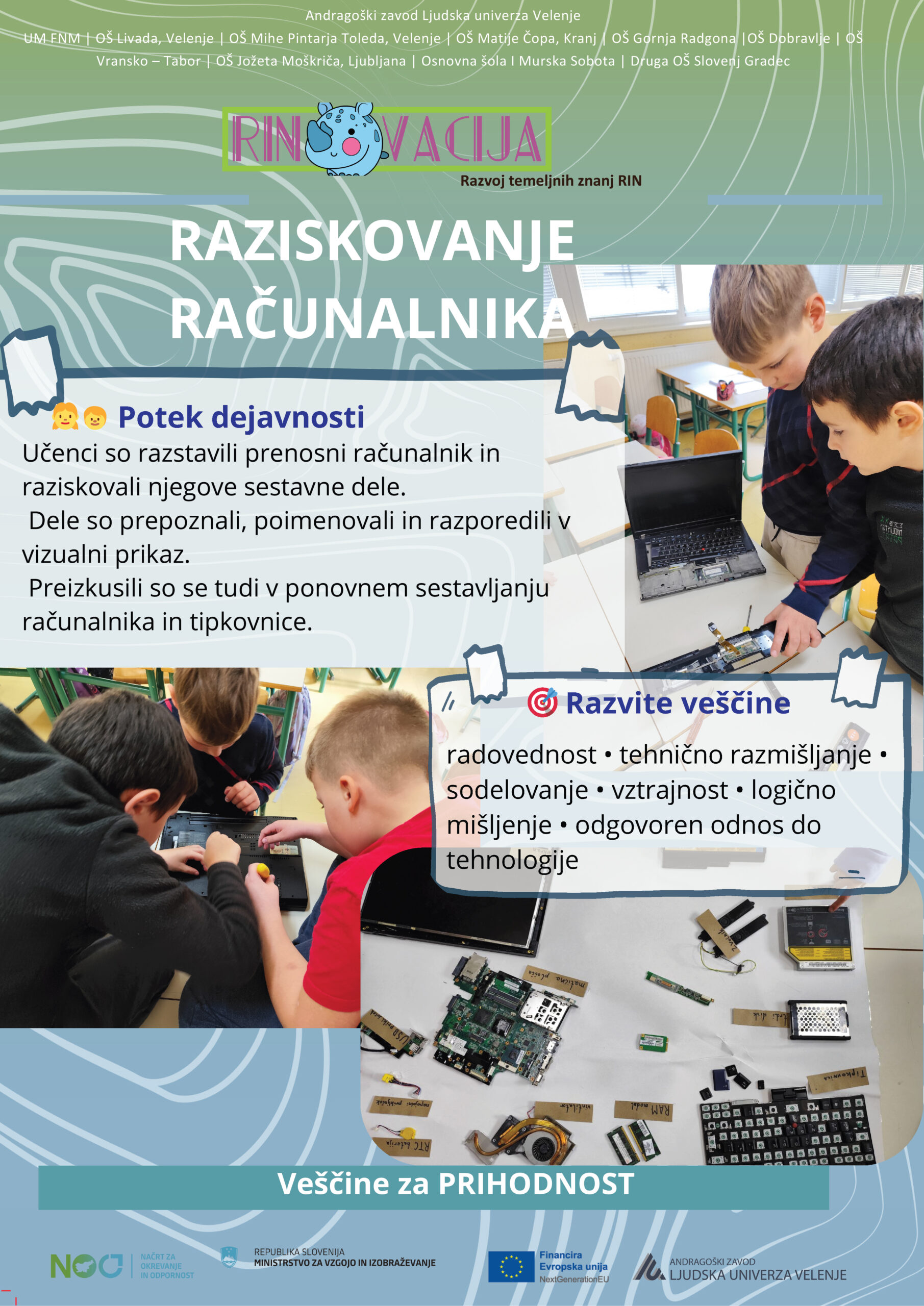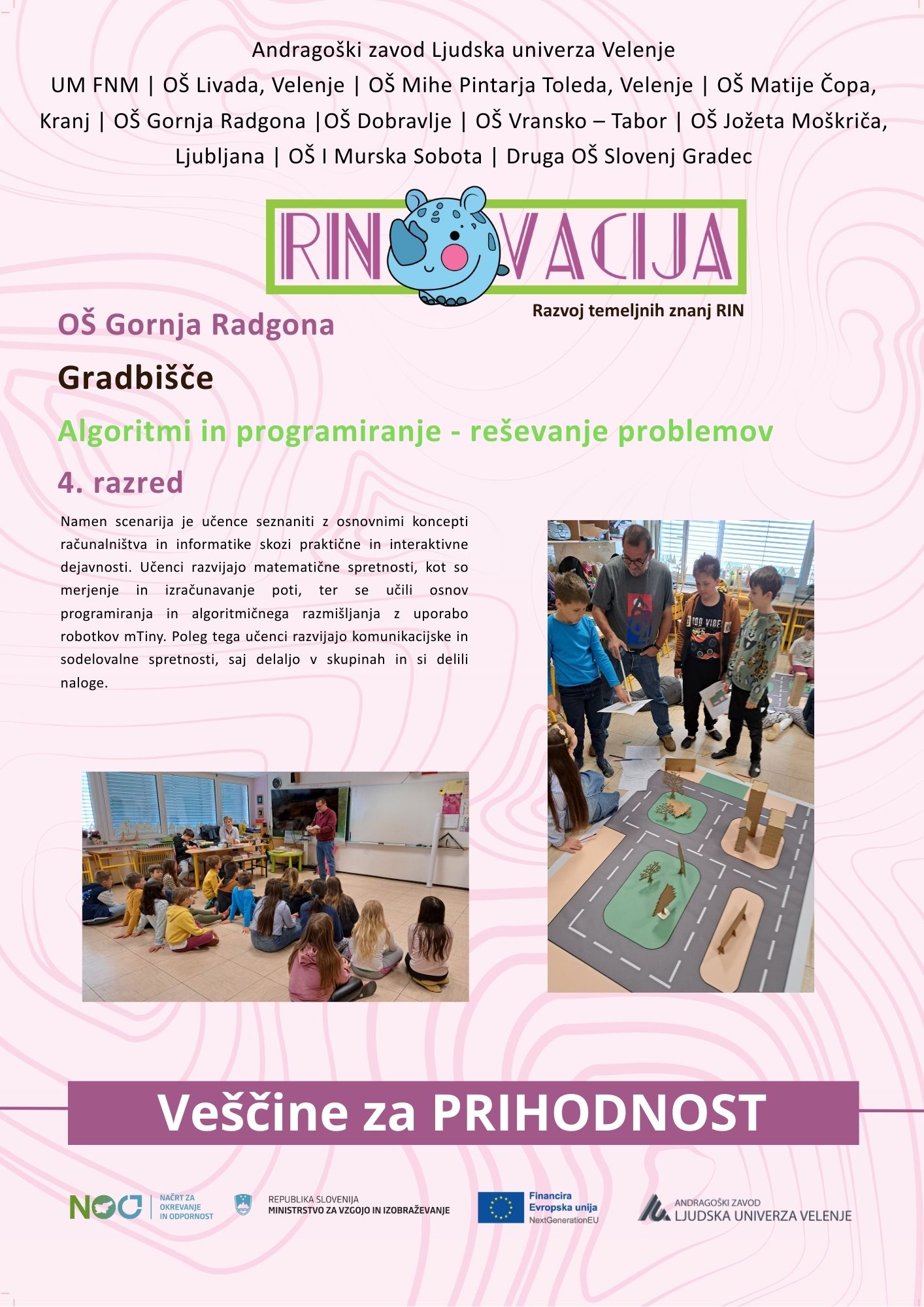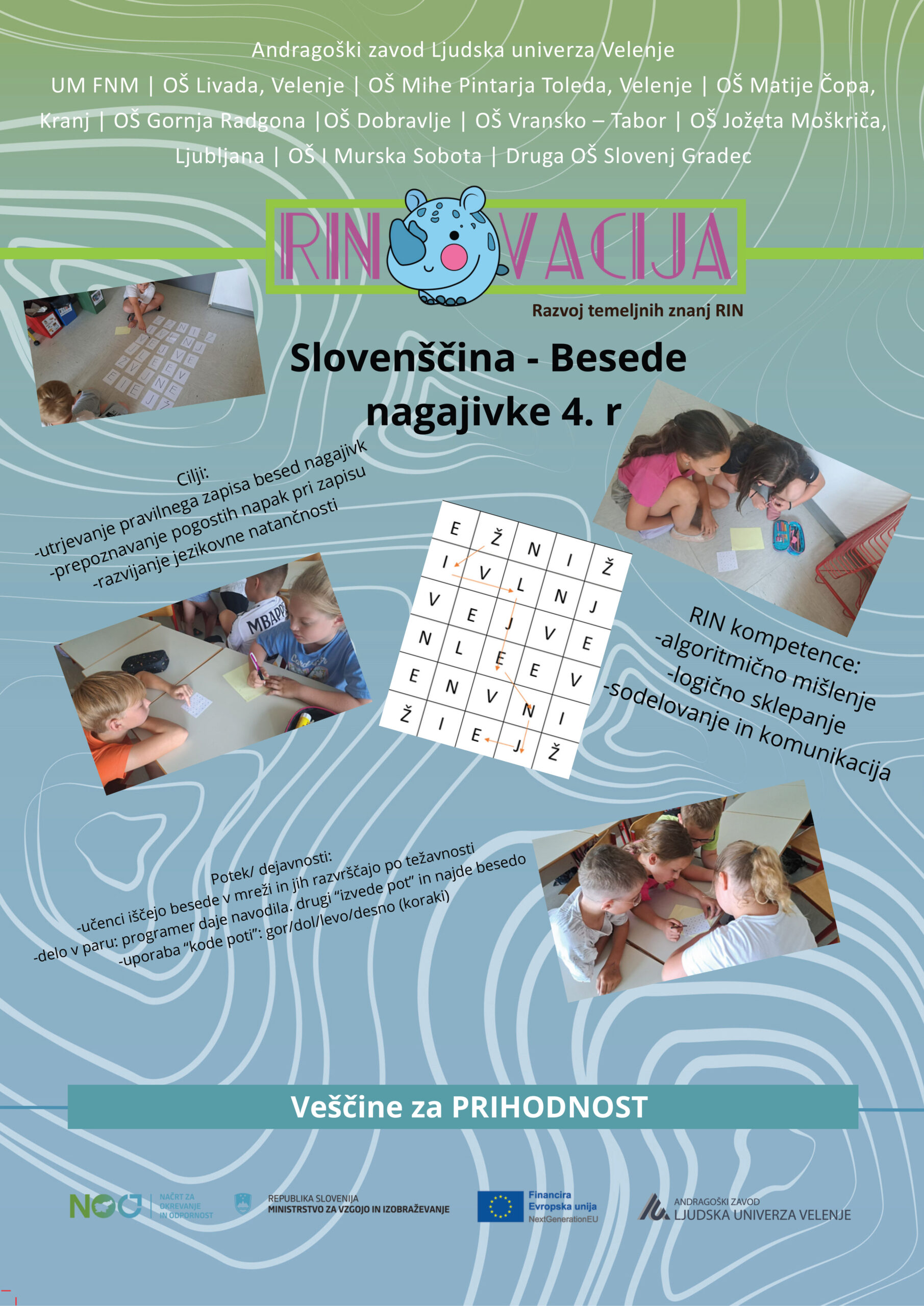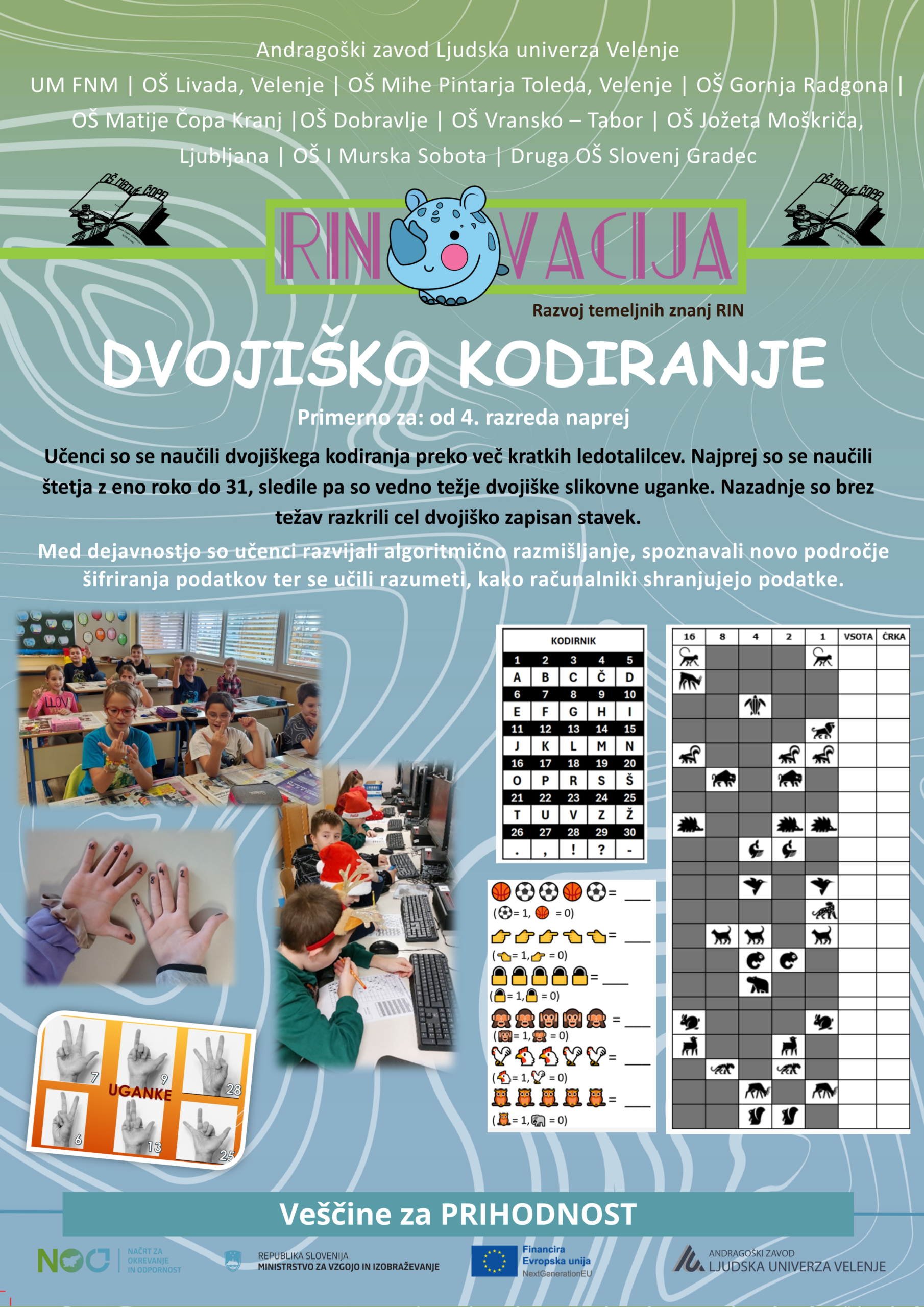 Projekt RINOvacija naslavlja enega ključnih izzivov sodobnega izobraževalnega sistema – razvoj digitalnih kompetenc in temeljnih znanj računalništva in informatike (RIN) pri učencih osnovnih šol. Temelji na prepoznani potrebi po usklajevanju pedagoških pristopov z realnostjo digitalne dobe ter na integraciji inovativnih učnih metod, ki spodbujajo razvoj tehničnih in mehkih veščin hkrati. Glavni cilj projekta je vzpostavitev inovativnih učnih okolij, kjer bodo učenci prek praktičnega dela, projektnega učenja in sodelovanja pridobivali temeljna znanja računalništva, programiranja, robotike ter razvijali kritično mišljenje, ustvarjalnost, timsko delo in digitalno pismenost. Pedagoški okvir RINOvacije je usklajen z evropskimi strategijami (npr. Priporočilo Sveta EU o ključnih kompetencah za vseživljenjsko učenje), smernicami Education 4.0 ter temelji na sodobnih raziskovalnih ugotovitvah in izkušnjah preteklih projektov (npr. RINOS, DigiSi mladi, AI4T ipd.). Uresničevanje ciljev bo potekalo znotraj konsorcija desetih osnovnih šol, Andragoškega zavoda Ljudska univerza Velenje kot prijavitelja, Univerze v Mariboru (FNM) kot evalvatorja in dveh zunanjih izvajalcev – podjetij CodeBrainer in Brihtna Buča. Projekt traja od septembra 2024 do junija 2026 in zajema dve šolski leti. Vključuje oblikovanje in implementacijo inovativnih oddelkov, razvoj učnih scenarijev in vsebin, izobraževanje učiteljev, dnevov dejavnosti z vsebinami RIN ter evalvacijo učinkov na ravni učencev in učiteljev. Vzpostavljena bodo tudi sodelovanja z lokalnim okoljem ter priložnosti za učence za sodelovanje na tekmovanjih in dogodkih s področja računalništva in informatike. RINOvacija je celovit odgovor na potrebe slovenskega šolskega prostora – ni le projekt, ampak vizija prihodnosti izobraževanja, kjer tehnologija ni sama sebi namen, temveč orodje za ustvarjanje, raziskovanje in izboljševanje sveta, v katerem živimo.