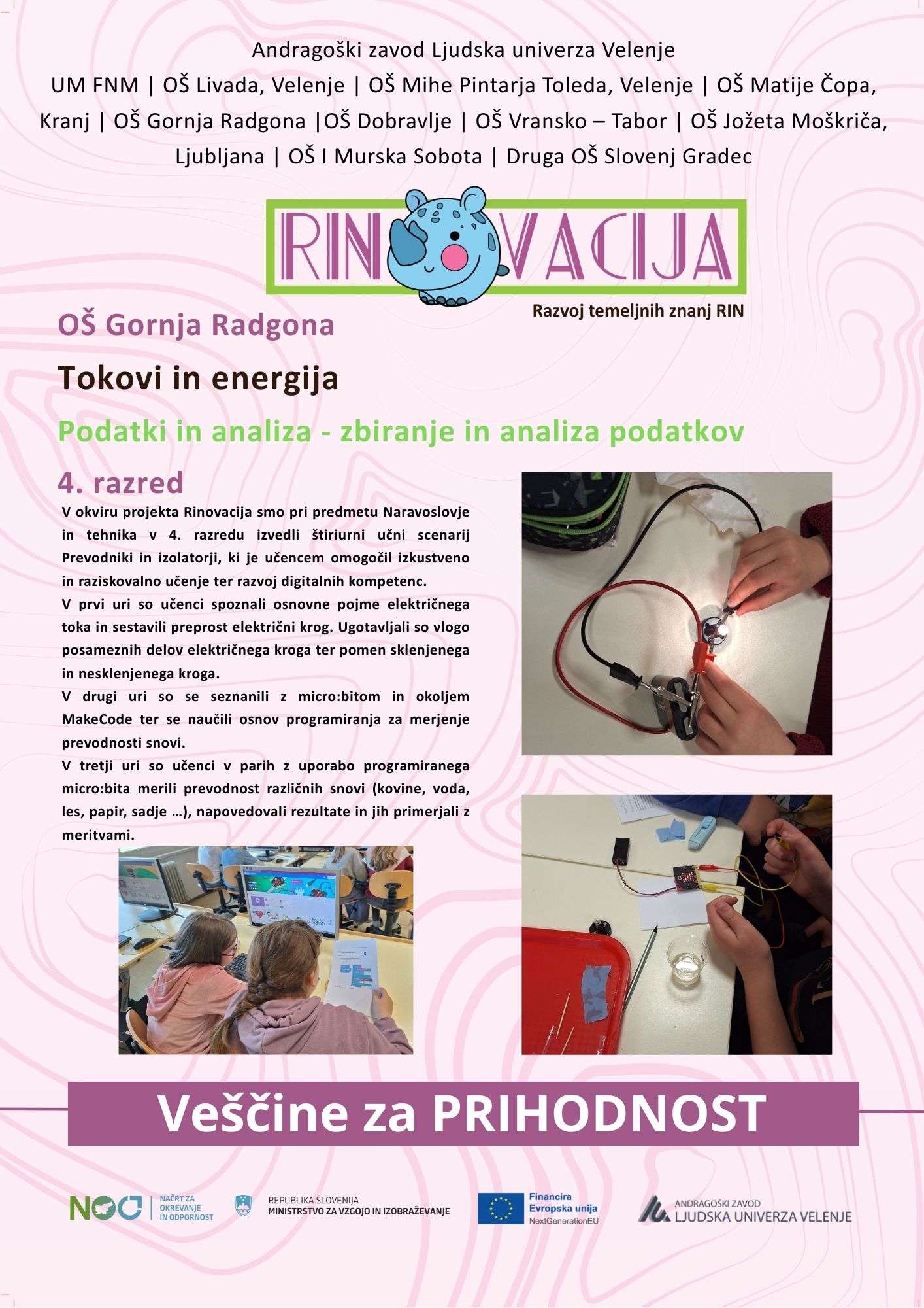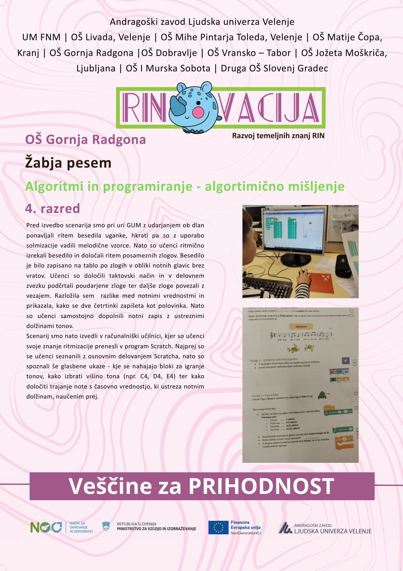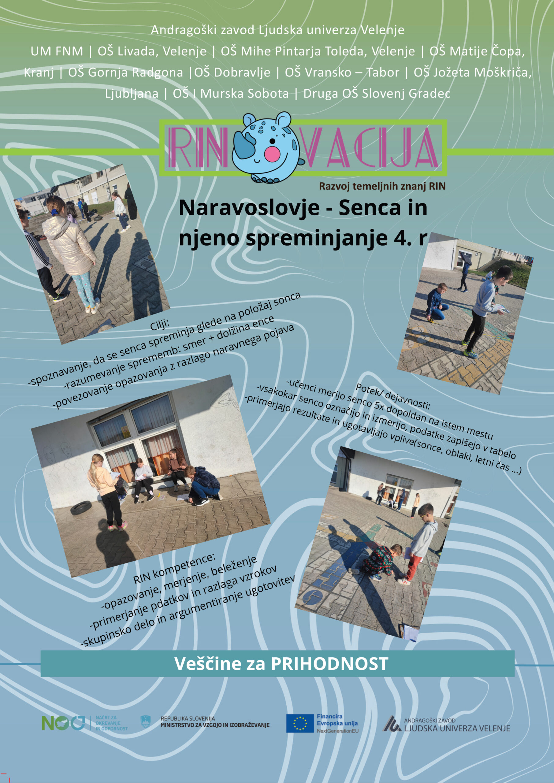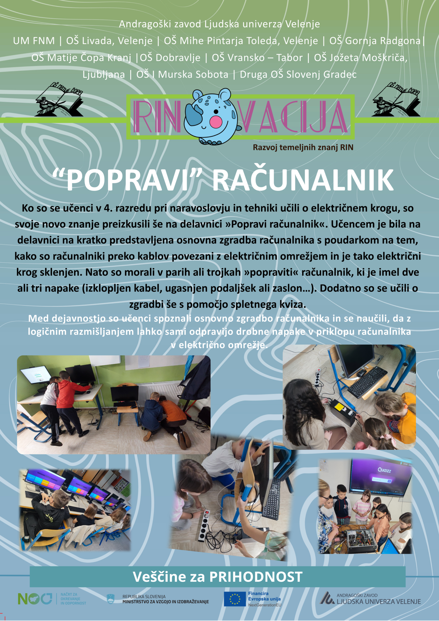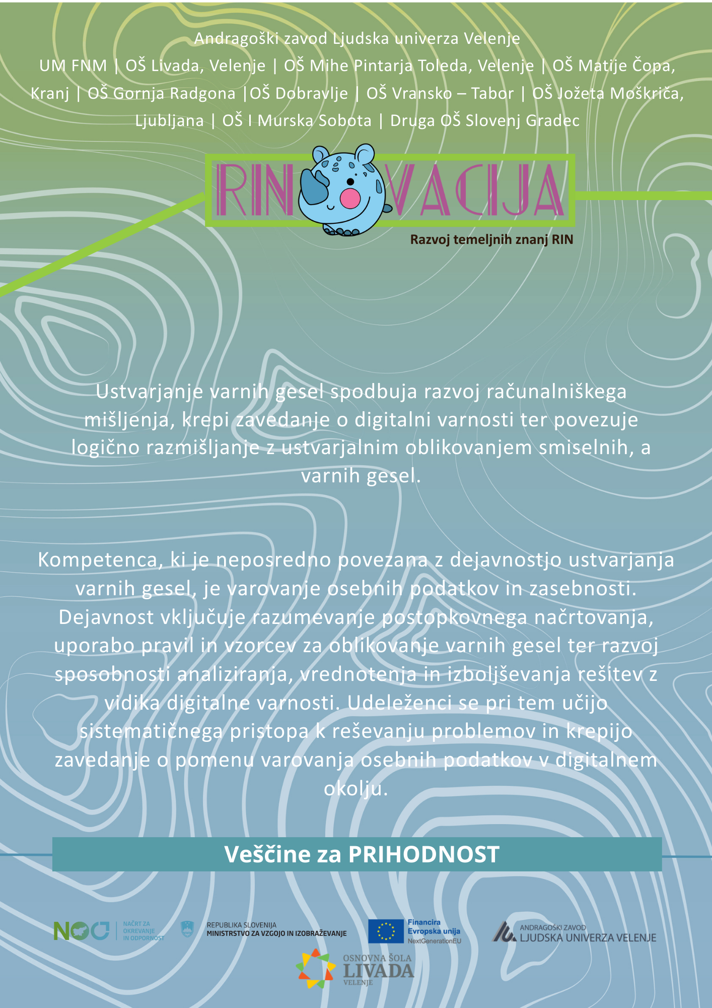 Projekt RINOvacija naslavlja enega ključnih izzivov sodobnega izobraževalnega sistema – razvoj digitalnih kompetenc in temeljnih znanj računalništva in informatike (RIN) pri učencih osnovnih šol. Temelji na prepoznani potrebi po usklajevanju pedagoških pristopov z realnostjo digitalne dobe ter na integraciji inovativnih učnih metod, ki spodbujajo razvoj tehničnih in mehkih veščin hkrati. Glavni cilj projekta je vzpostavitev inovativnih učnih okolij, kjer bodo učenci prek praktičnega dela, projektnega učenja in sodelovanja pridobivali temeljna znanja računalništva, programiranja, robotike ter razvijali kritično mišljenje, ustvarjalnost, timsko delo in digitalno pismenost. Pedagoški okvir RINOvacije je usklajen z evropskimi strategijami (npr. Priporočilo Sveta EU o ključnih kompetencah za vseživljenjsko učenje), smernicami Education 4.0 ter temelji na sodobnih raziskovalnih ugotovitvah in izkušnjah preteklih projektov (npr. RINOS, DigiSi mladi, AI4T ipd.). Uresničevanje ciljev bo potekalo znotraj konsorcija desetih osnovnih šol, Andragoškega zavoda Ljudska univerza Velenje kot prijavitelja, Univerze v Mariboru (FNM) kot evalvatorja in dveh zunanjih izvajalcev – podjetij CodeBrainer in Brihtna Buča. Projekt traja od septembra 2024 do junija 2026 in zajema dve šolski leti. Vključuje oblikovanje in implementacijo inovativnih oddelkov, razvoj učnih scenarijev in vsebin, izobraževanje učiteljev, dnevov dejavnosti z vsebinami RIN ter evalvacijo učinkov na ravni učencev in učiteljev. Vzpostavljena bodo tudi sodelovanja z lokalnim okoljem ter priložnosti za učence za sodelovanje na tekmovanjih in dogodkih s področja računalništva in informatike. RINOvacija je celovit odgovor na potrebe slovenskega šolskega prostora – ni le projekt, ampak vizija prihodnosti izobraževanja, kjer tehnologija ni sama sebi namen, temveč orodje za ustvarjanje, raziskovanje in izboljševanje sveta, v katerem živimo.