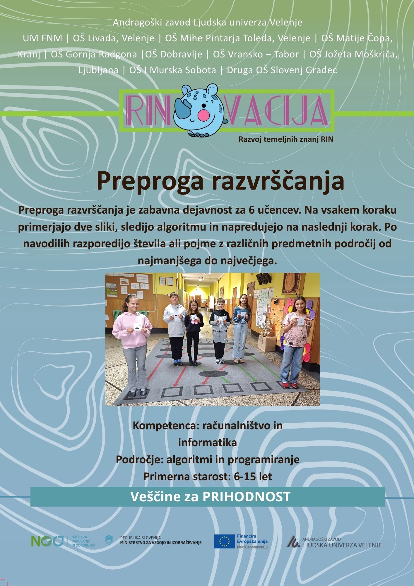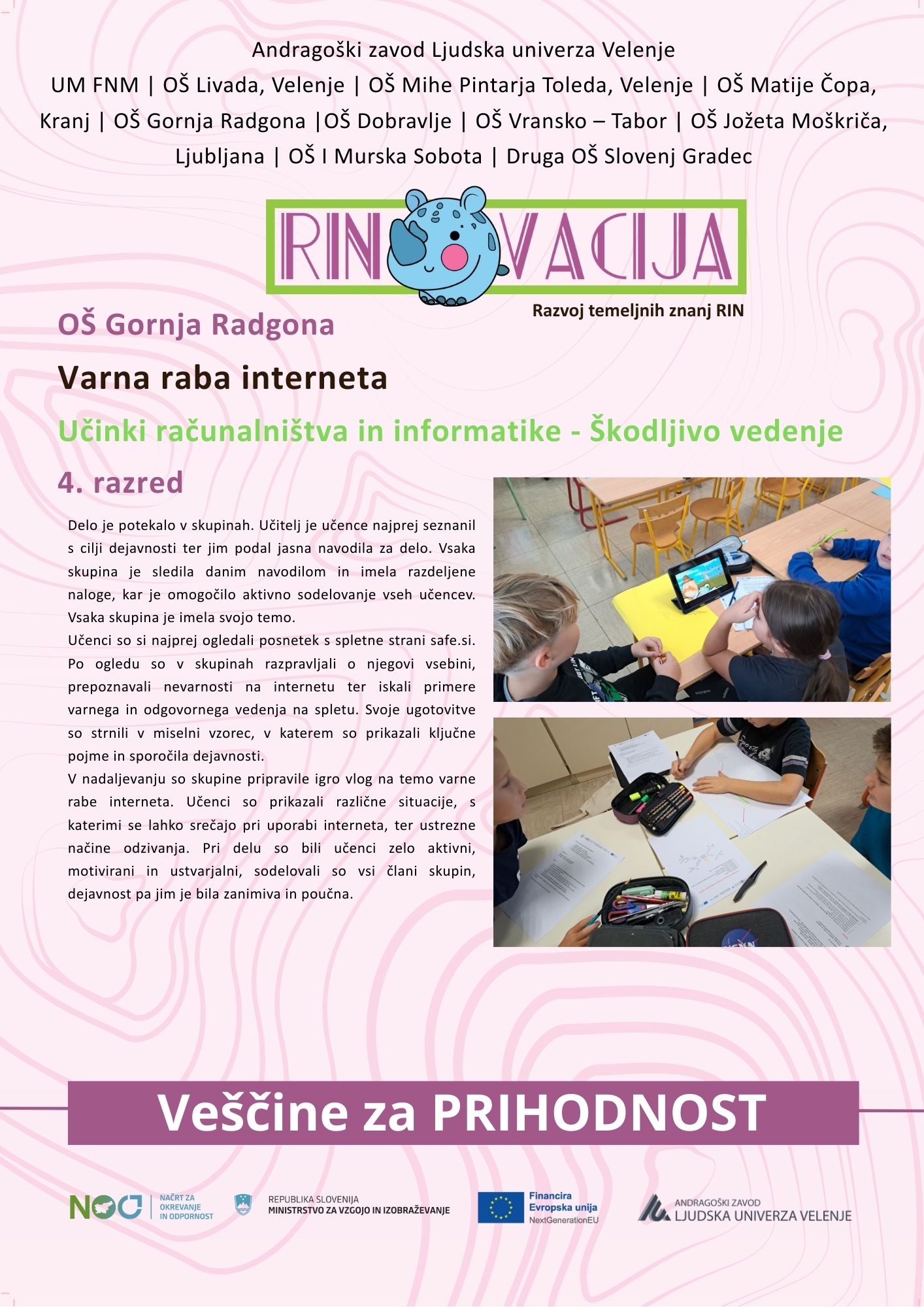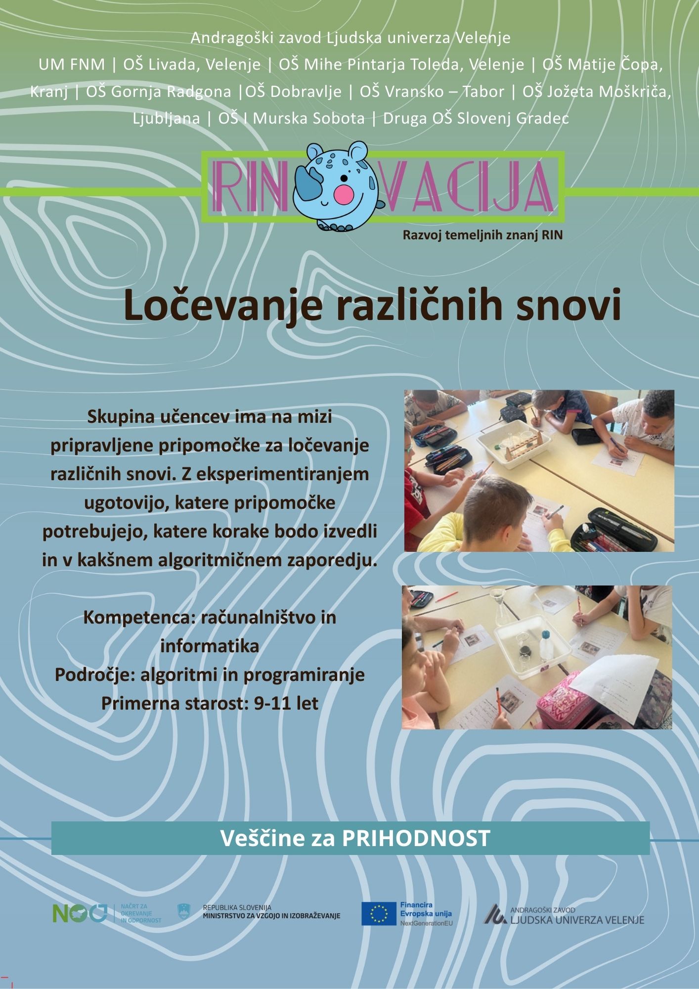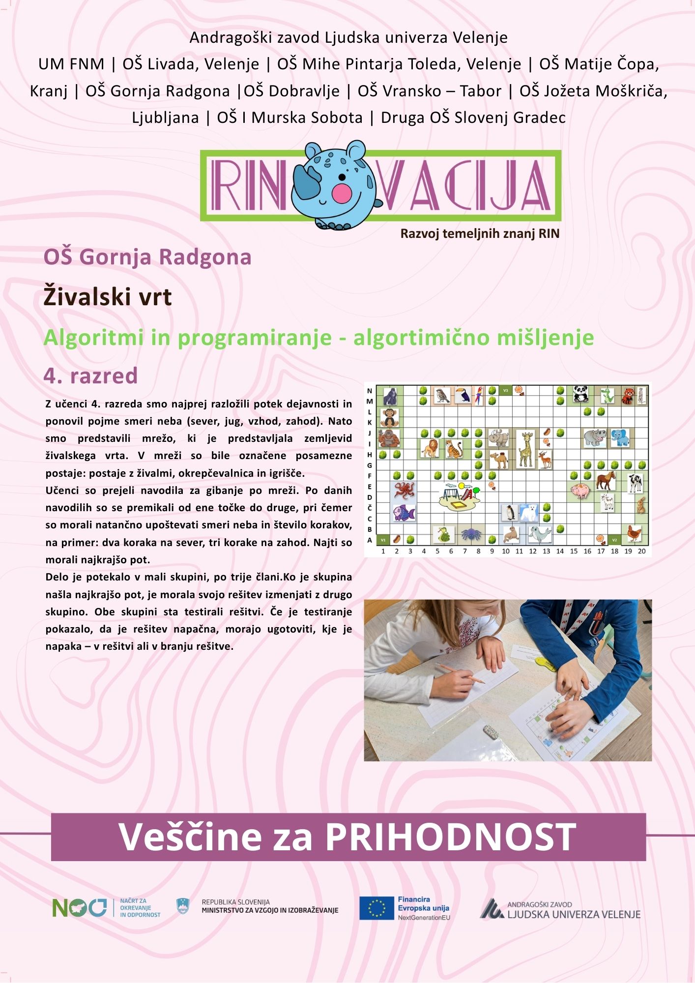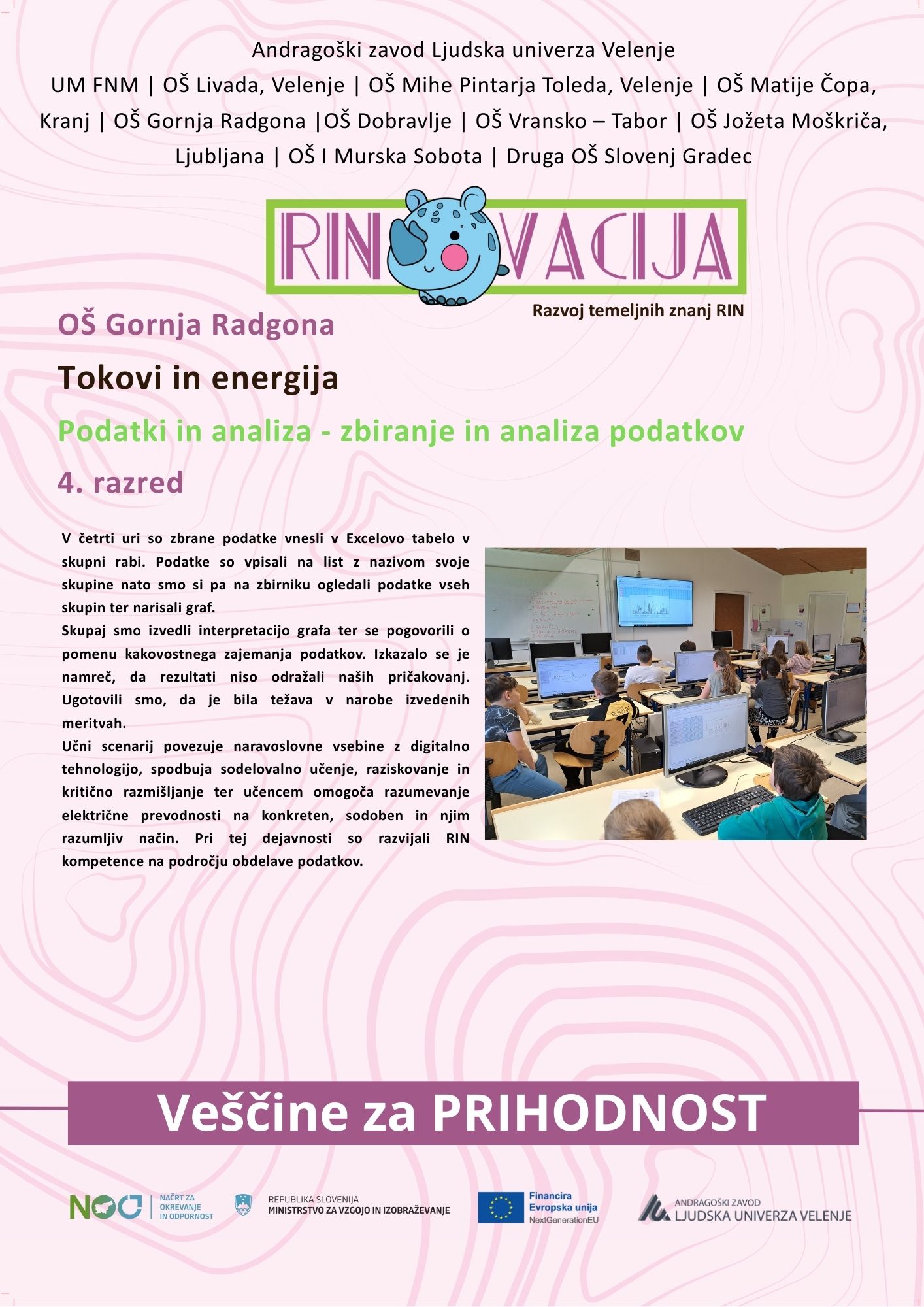 Projekt RINOvacija naslavlja enega ključnih izzivov sodobnega izobraževalnega sistema – razvoj digitalnih kompetenc in temeljnih znanj računalništva in informatike (RIN) pri učencih osnovnih šol. Temelji na prepoznani potrebi po usklajevanju pedagoških pristopov z realnostjo digitalne dobe ter na integraciji inovativnih učnih metod, ki spodbujajo razvoj tehničnih in mehkih veščin hkrati. Glavni cilj projekta je vzpostavitev inovativnih učnih okolij, kjer bodo učenci prek praktičnega dela, projektnega učenja in sodelovanja pridobivali temeljna znanja računalništva, programiranja, robotike ter razvijali kritično mišljenje, ustvarjalnost, timsko delo in digitalno pismenost. Pedagoški okvir RINOvacije je usklajen z evropskimi strategijami (npr. Priporočilo Sveta EU o ključnih kompetencah za vseživljenjsko učenje), smernicami Education 4.0 ter temelji na sodobnih raziskovalnih ugotovitvah in izkušnjah preteklih projektov (npr. RINOS, DigiSi mladi, AI4T ipd.). Uresničevanje ciljev bo potekalo znotraj konsorcija desetih osnovnih šol, Andragoškega zavoda Ljudska univerza Velenje kot prijavitelja, Univerze v Mariboru (FNM) kot evalvatorja in dveh zunanjih izvajalcev – podjetij CodeBrainer in Brihtna Buča. Projekt traja od septembra 2024 do junija 2026 in zajema dve šolski leti. Vključuje oblikovanje in implementacijo inovativnih oddelkov, razvoj učnih scenarijev in vsebin, izobraževanje učiteljev, dnevov dejavnosti z vsebinami RIN ter evalvacijo učinkov na ravni učencev in učiteljev. Vzpostavljena bodo tudi sodelovanja z lokalnim okoljem ter priložnosti za učence za sodelovanje na tekmovanjih in dogodkih s področja računalništva in informatike. RINOvacija je celovit odgovor na potrebe slovenskega šolskega prostora – ni le projekt, ampak vizija prihodnosti izobraževanja, kjer tehnologija ni sama sebi namen, temveč orodje za ustvarjanje, raziskovanje in izboljševanje sveta, v katerem živimo.
